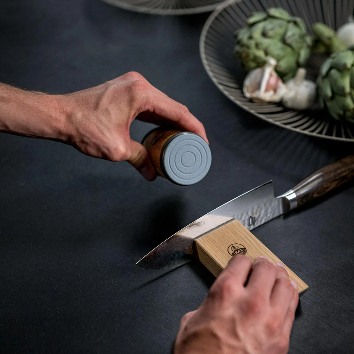 Die im Lieferumfang ebenfalls enthaltene Magnet – Schleiflehre wurde ebenfalls optimiert und besitzt nun sowohl den Allzweckwinkel von 20° als auch einen 15° Winkel. Sie hält das Messer automatisch im jeweiligen Winkel fest und sorgt so für ein schnelles und hochwertiges Schärfergebnis.