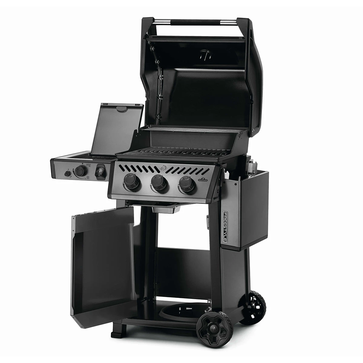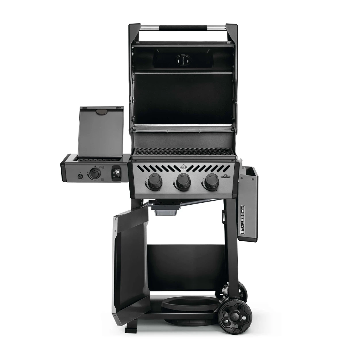 Mit dem abklappbaren Seitentisch rechts ist der Napoleon Freestyle äußerst kompakt und lässt sich auch bei kleinstem Platzangebot unterbringen.