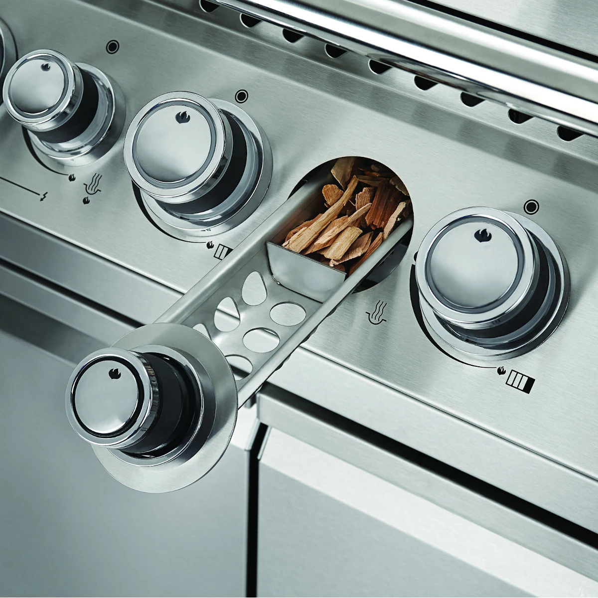 Für ein ganz besonderes Grillaroma einfach nach Belieben Räucherchips in das integrierte Edelstahl-Gehäuse füllen und den darunterliegenden Räucherbrenner einschalten.